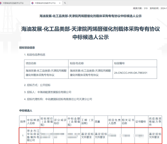 江华环保中标中海油丙烯醛催化剂载体采购项目
