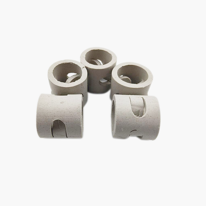 陶瓷鲍尔环填料是在陶瓷拉西环的基础上开发的一种高径相等的开孔环型填料,每层窗孔有5个舌叶,每个舌叶内弯指向环心,上下两层窗孔的位置相反错开,一般开孔面积约占环壁总面积的30%左右,使得填料塔内的气体和液体能够从窗孔自由通过,改善了气液分布,充分利用了环的内表面。