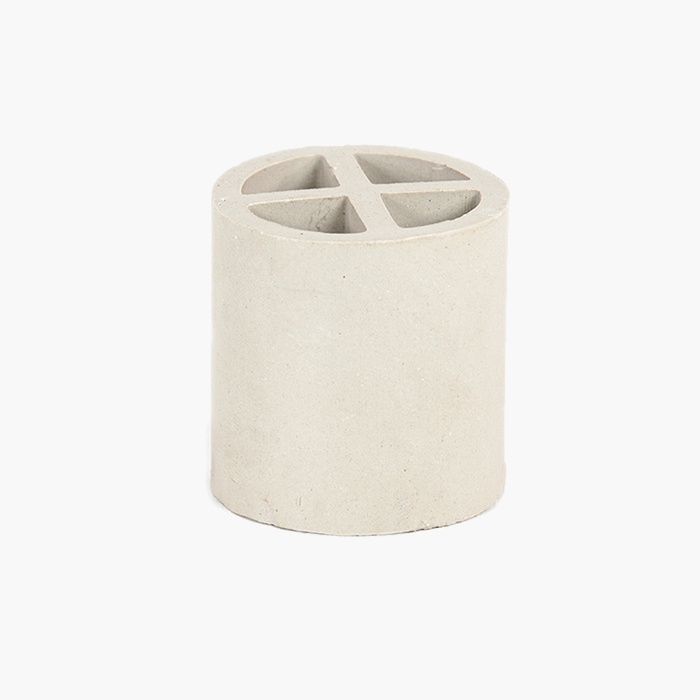 陶瓷十字隔板环填料是基于增加填料的比表面积,从而强化传质效率而开发出来的。 其形状是在拉西环中间增设了十字隔板。 一般来讲,这种填料由于尺寸较大,仅适用于整体堆彻,目前一般只作为乱堆填料的塔底支撑分布层用。