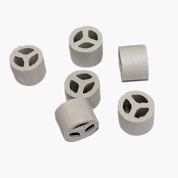 陶瓷三丫环填料是一种经外观独特设计加工成的一种新型高效散堆填料,产品高径比约为2:1,内部设有一个或三个“Y”型隔板,这样增大比表面积,提高了汽液分散性能,使汽液接触更充分。三丫环填料是从阶梯环、共钜环、扁环、矩鞍环的基础上以及在形状、外观和结构综合考虑,进行取长补短而改进的。