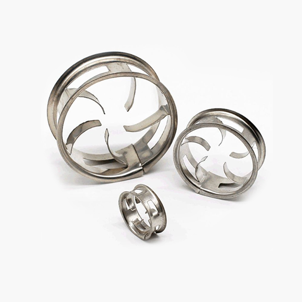 金属阶梯环填料是一种新型开孔型填料。它的高约为直径的一半,一边有锥形翻边,环壁上开有窗孔,并有弯曲叶片伸向环心。由于此些特殊结构,改善了填料层内气液分布,增加了气液接触点,有利于液体汇聚分散及膜表面的不断更新,使传质得到强化,分离效率大大提高。