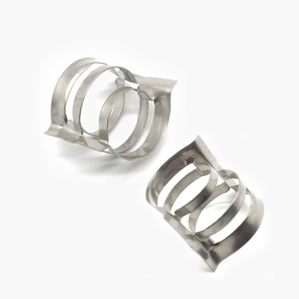 金属共轭环填料揉合了环形和鞍形填料的优点,采用共轭曲线肋片相结构,两端外卷边及合适的长径比、填料间或填料于踏壁间均为点接触,不会产生叠套、孔隙均匀、阻力小、乱堆时取定向排列,故有规整填料的特点,有较好的流体力学和传质性能。
